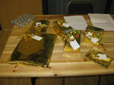 Here are the raffle prizes, tantalisingly wrapped. I wonder how many have survived temptation to be put under the tree? I know mine didn't!
