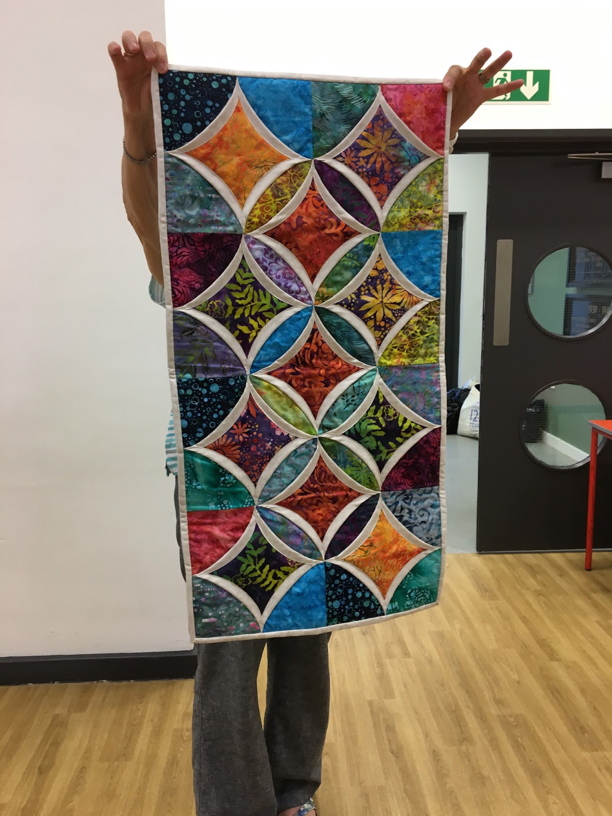 Ann kindly sent me some photos of the show and tell. Firstly there are some images of the work done in Stuart Hillard’s recent Cathedral Window workshop. People made various items from their work. Here is Paula's bag and a cushion.